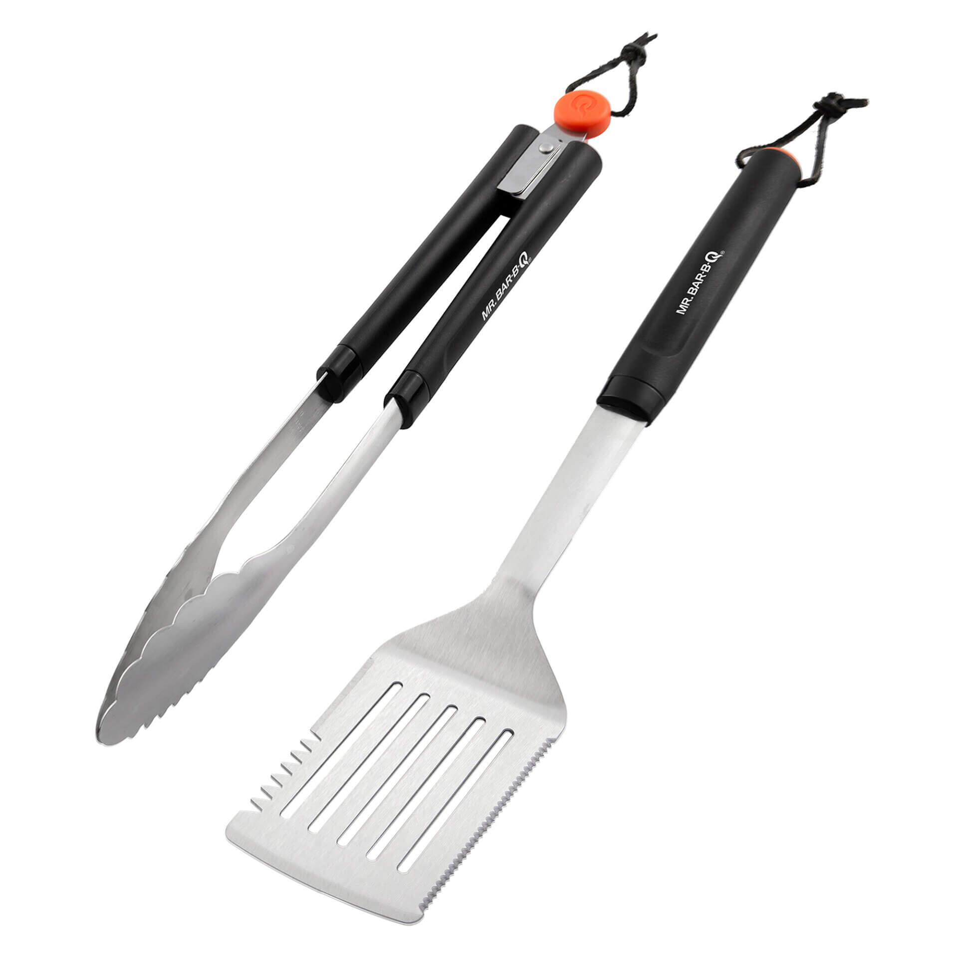 Fire the grill with the 2 Piece Tool Set from Mr. Bar-B-Q®. Crafted from durable, high-quality stainless steel, these grilling essentials are built for reliability and performance. The locking tongs make it easy to grip, toss, and serve food at barbecues, cookouts, and parties, while the 3-in-1 spatula flips, slices, and tenderizes with ease. Each tool features a comfort-grip handle for control while grilling and a hanging loop for convenient storage.