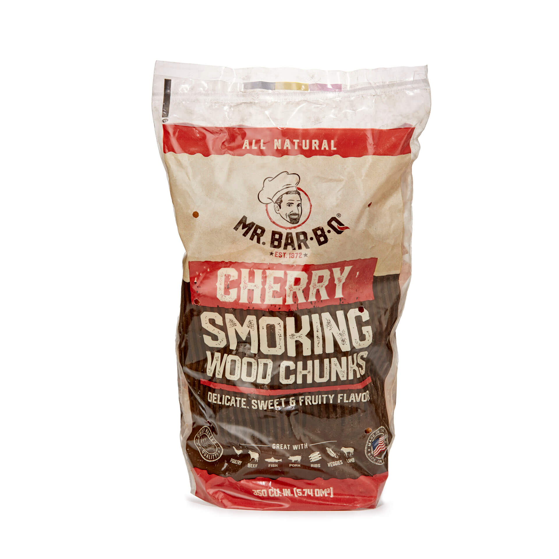 Mr. Bar-B-Q Cherry Smoking Chunks in a 350 cubic inch bag are professional-grade smoking wood products designed for commercial foodservice applications. Crafted from natural cherry hardwood, these smoking chunks deliver consistent flavor infusion when used in barbecue smokers, wood-fired ovens, or grilling stations. With a high density of flavor-rich wood, it provides an efficient smoke source suitable for medium-duty operations such as restaurant-grade barbecue, catering, and food preparation facilities. This product’s technical design ensures minimal ash residue and ease of maintenance, making it ideal for continuous culinary workflows requiring reliable smoke generation with precise flavor control.