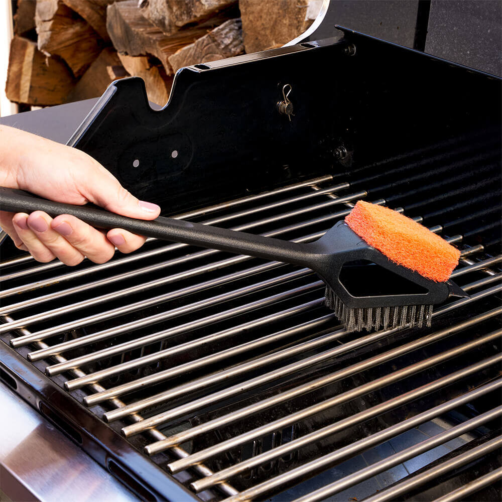 When one side isn’t enough, the Dual Grill Brush by Mr. Bar-B-Q® delivers powerful, versatile cleaning to keep your grill in top shape. Designed with 4x stainless steel bristle strength on one side and an abrasive scrubbing pad on the other, this dual-sided brush tackles grease, residue, and stubborn burnt-on food with ease. Engineered for safer cleaning, the bristles are rigorously tested to help minimize the risk of dislodging. Independently tested by third-party labs to meet industry safety standards, this grill brush gives you confidence every time you clean. An easy-grip handle and integrated metal scraper add extra control and cleaning power for a truly spotless grill.