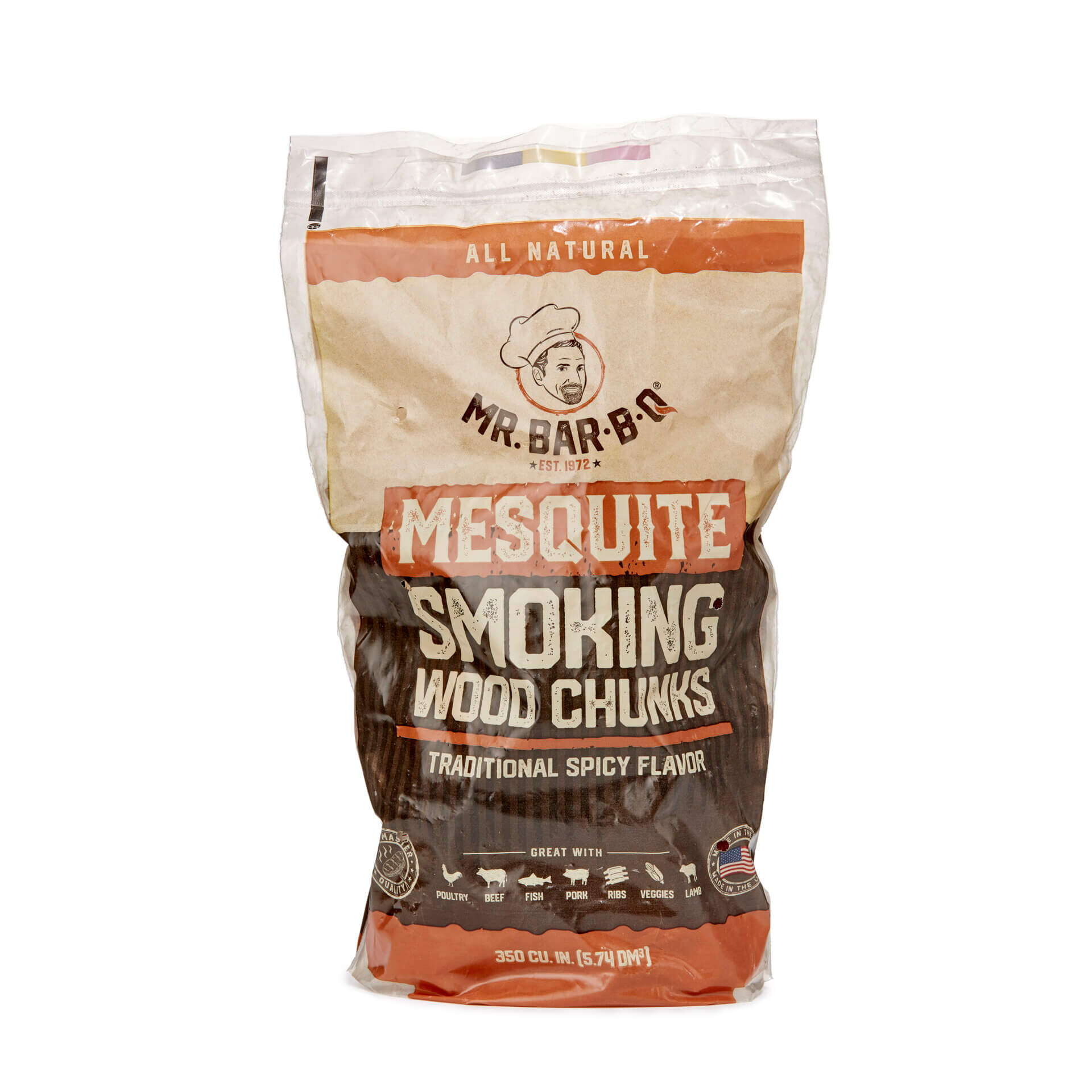 Mr. Bar-B-Q Mesquite Smoking Chunks, designed as commercial-grade smoking wood for culinary professionals, are optimized for robust flavor infusion in smoking applications. These mesquite chunks, with a total volume of 350 cubic inches per bag, serve precisely cut wood pieces that facilitate efficient fuel burning and consistent smoke production. Crafted for use in smokehouses, pellet smokers, and wood-fired grills, they provide a reliable source of mesquite aroma, ideal for enhancing the flavor profile of smoked meats and other culinary items. The product’s technical attribute of uniform chunk size ensures predictable combustion, enabling restaurateurs and pitmasters to maintain quality consistency during extended smoking sessions.