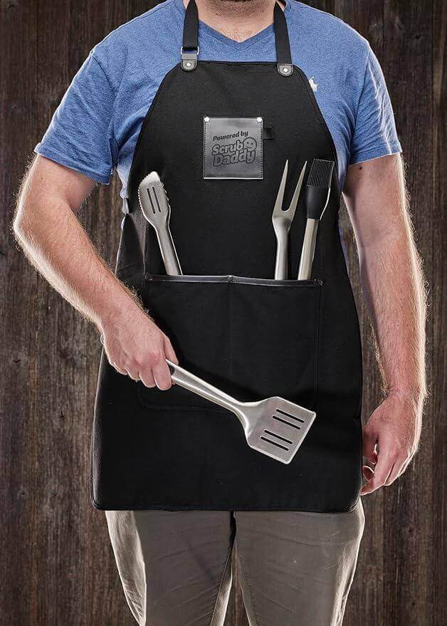 The Barbecue Grilling Apron, powered by Scrub Daddy is designed for durability and functionality. Made from a sturdy canvas blend, it provides protection while grilling. It features three multipurpose pockets for easy access to tools like tongs and spatulas. The apron includes smooth leather accents and an adjustable strap for a comfortable, custom fit. Combining a sleek design and coverage for any grilling session.