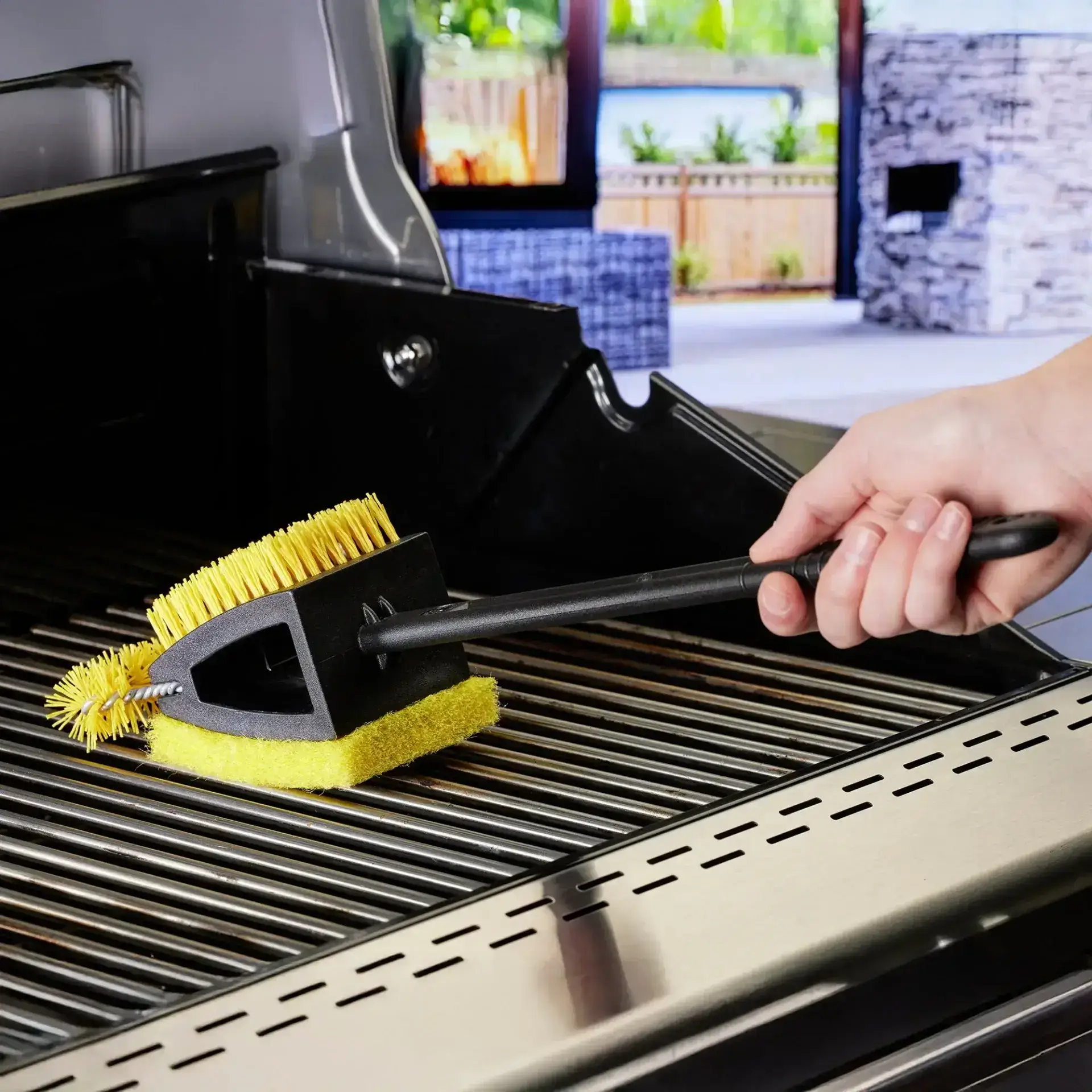 Keep your grill looking like new with the XL Triple Action Grill Brush, powered by Scrub Daddy®. Designed for use on cool surfaces and compatible with all types of grills, this brush offers three powerful cleaning features to get your grill in top shape. It includes twisted wires on top, specifically designed for cold grates, and durable nylon bristles—an excellent alternative to stainless steel. For best results, pair it with the All-in-One Grill Cleaner (60410SDZ) and tackle stubborn grime with the built-in abrasive scrubber pad.Made with 50% recycled plastic, the handle helps reduce waste—make a change today.