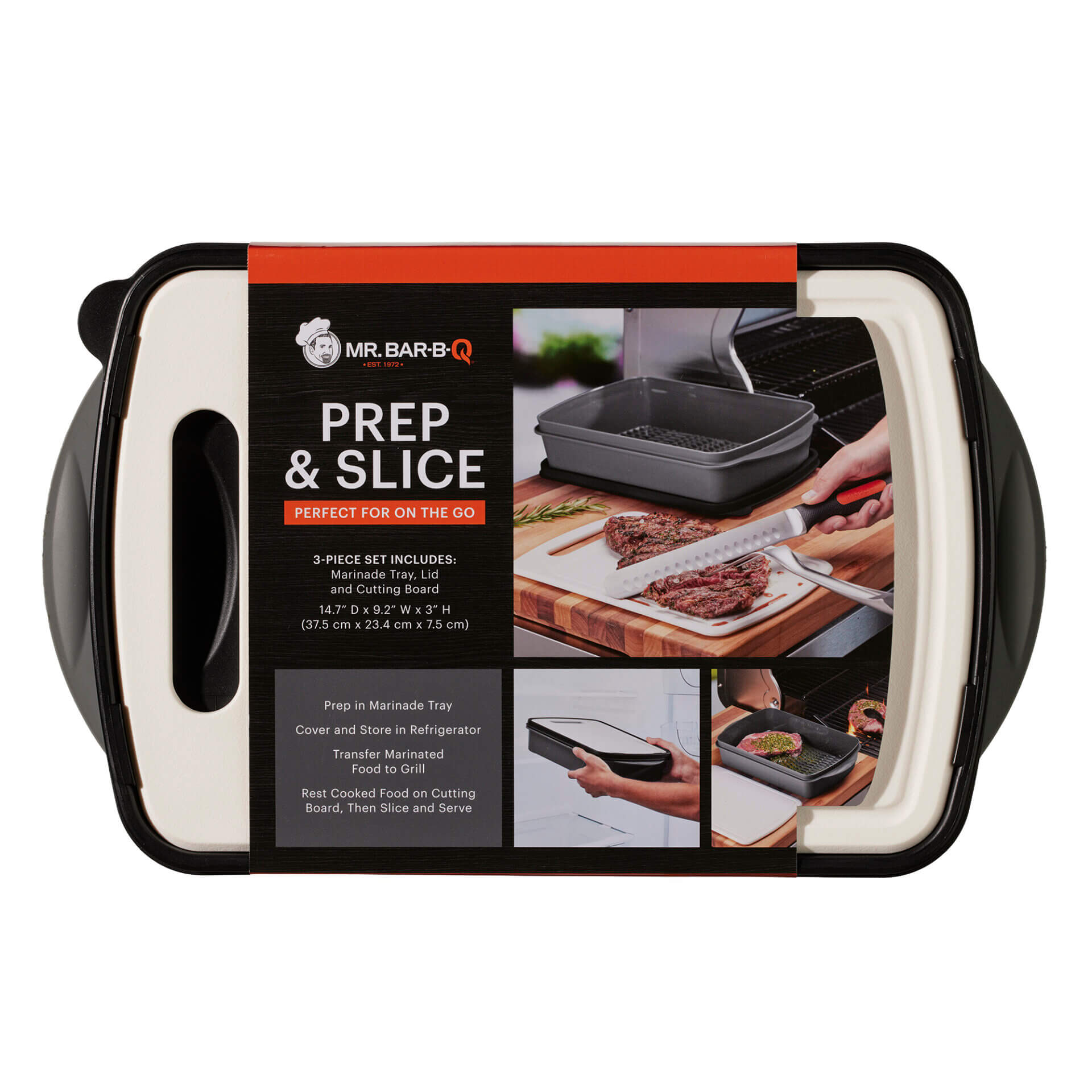 - Marinade tray with built-in cutting board that snaps into lid