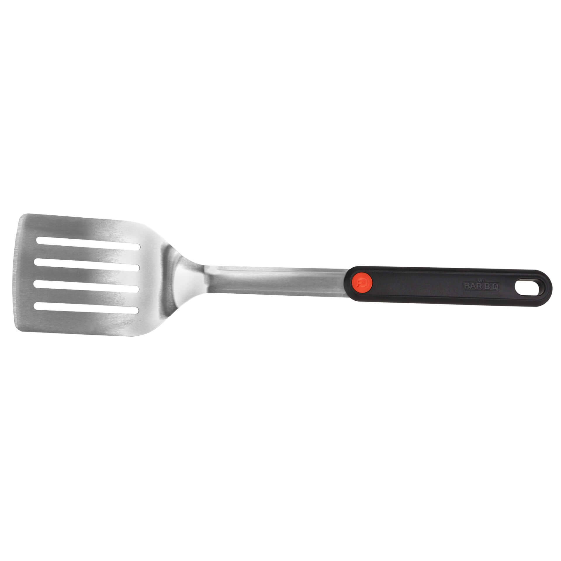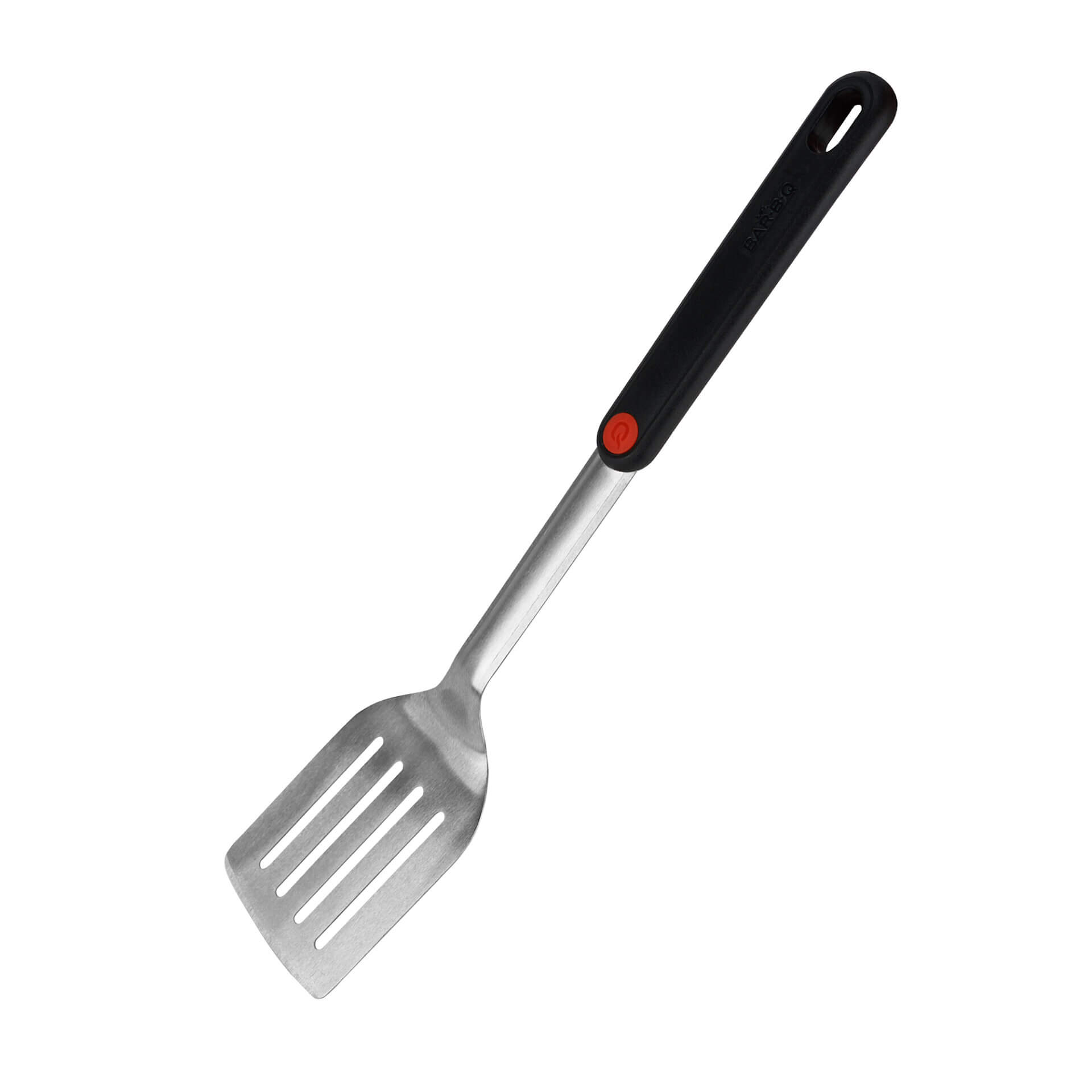 This BBQ Spatula features stainless steel construction, a unique “Q Branded” patented plastic handle with ergonomic plastic handles, and a non-slip, professionally balanced design.